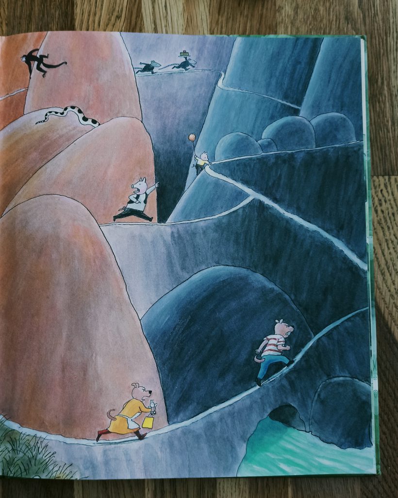 Książka „Gdzie jest tort?” The Tjong-Khing to absolutnie nietuzinkowa pozycja, która od wielu lat dostępna jest na polskim rynku wydawniczym. Na jej kartach nie znajdziemy ani jednego słowa, a jednak jej przeglądanie staje się wspaniałą zabawą i okazją do tworzenia kolejnych historii zarówno przez dziecko, jak i rodzica. Możemy wspólnie m.in. śledzić, gdzie podział się skradziony z ogrodu Państwa Psytulińskich tytułowy tort, podglądnąć dokąd zmierza żółw, w co grają żaby, odkryć, gdzie podziało się jedenaste kaczątko, dlaczego mały króliczek płacze, a kameleon ma czerwoną pupę, bądź wypatrywać kolejnych przygód prosiaczka. Możliwości wspólnego „przegadania” z dzieckiem tej książki jest naprawdę bardzo, bardzo wiele.